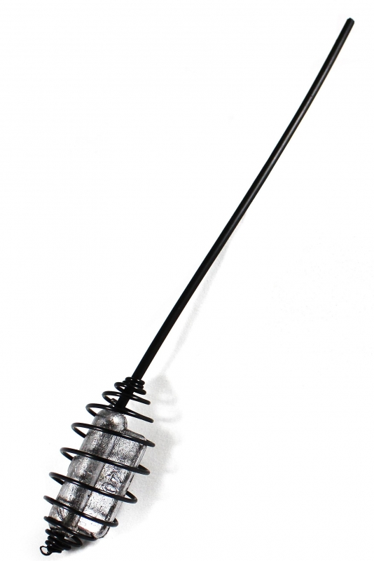 Krmítko průběžné s excentrickým olovem a dlouhou trubičkou. Excentrické olovo zabraňuje kroucení vlasce a dlouhá trubička brání zamotání při náhozu.