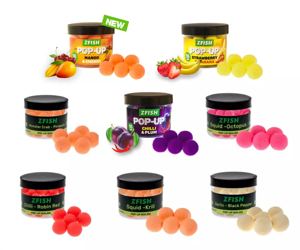 Představujeme vám žhavou novinku do naší rodiny boilies, která dokonale zapadá a ucelí naší řadu krmení. Jedná se o POP–UP boilies, které má stejné příchutě jako naše krmné boilies ZFISH Megamix 5kg a CSL Boostery Promix, spolu tak dokonale tvoří svatou trojici pro úspěšný lov kaprů. Tyto nové plovky se vyznačují velmi atraktivními fluo barvami, mají výborný výtlak, takže se skvěle hodí pro Ronnie Rig a Zig Rig montáže a samozřejmě běžné nastražení pop-upů, nebo na „panáčka“ je s nimi rovněž dokonalé, zároveň dobře sají a bezproblémů tak přijímají další posilovače. Mezi klíčové výhody patří dlouho trvající aroma i po delším namočení ve vodě.