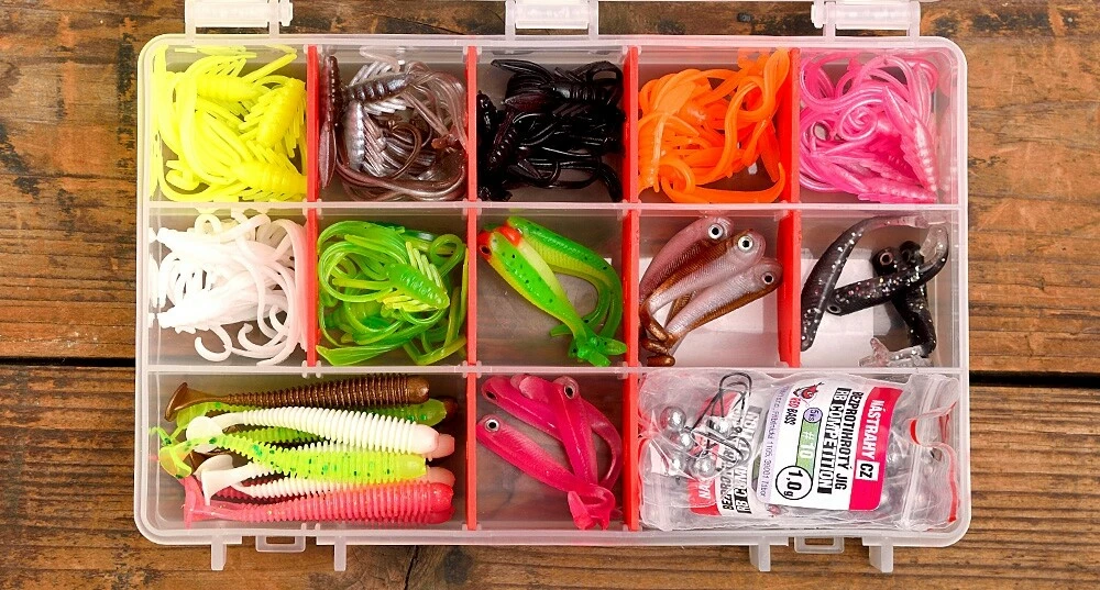 Pečlivě vybraná sada osvědčených nástrah pro lov pstruhů duhových, sivenů a k nim odpovídající jigové hlavičky vč. krabičky S. Další info