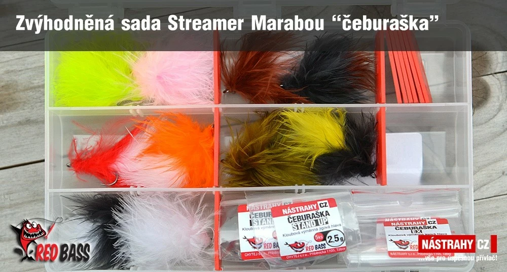 Sada účinných streamerů marabou "čeburaška" a vhodných čeburašek (vyměnitelná kloubová zátěž). Streamer marabou "čeburaška" je účinná netradiční nástraha z jemného peří speciálně vyrobená nejen pro kombinaci s čeburaškou (použit háček s velkým očkem). Další info